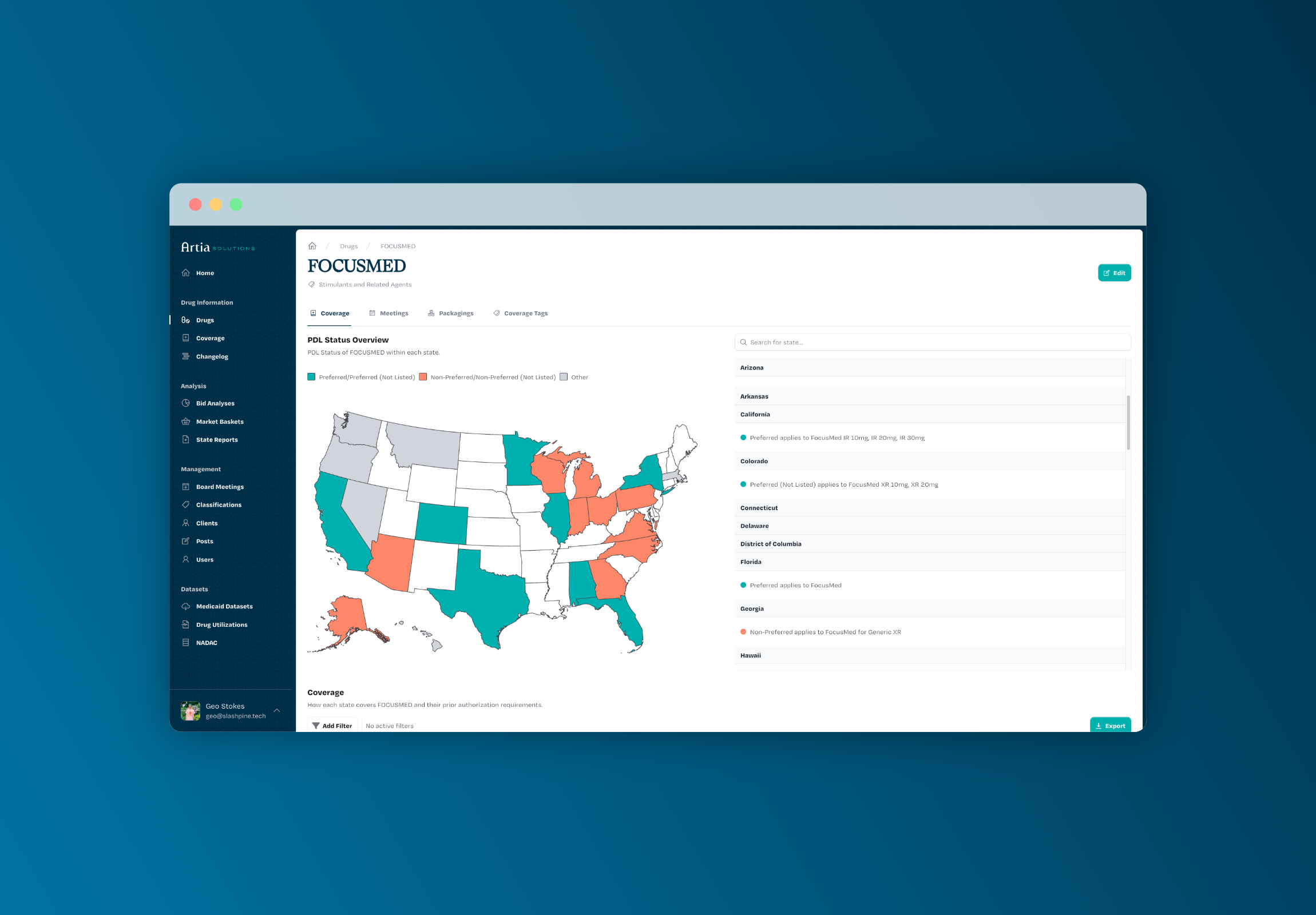 We began by embedding ourselves in Artia's workflows to understand the intricacies of pharmaceutical consulting and Medicaid data management. Rather than simply digitizing existing processes, we partnered with Artia to reimagine how pharmaceutical intelligence could be delivered.